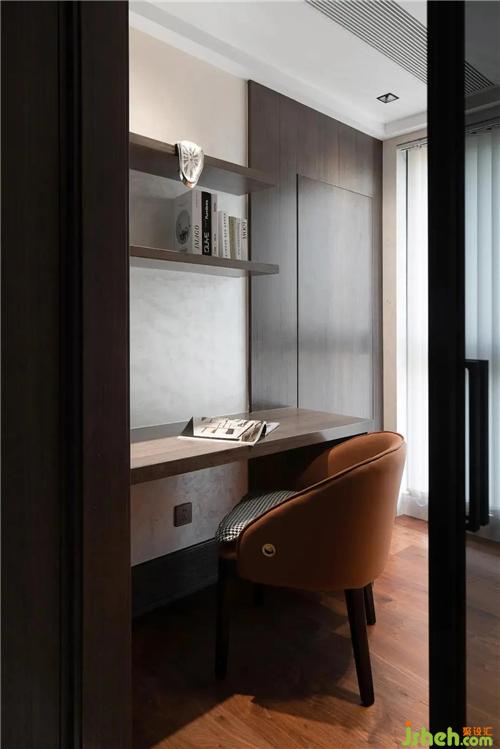 書房沿用了客廳一貫的風格,灰白色系讓整個空間簡單而利落,深橘色的靠椅讓人眼前一亮。書桌的對側(cè)則安置了正面墻的書柜,達到最大的收納功能。百葉窗式的簾子與流淌的時鐘擺件營造出法式氛圍。