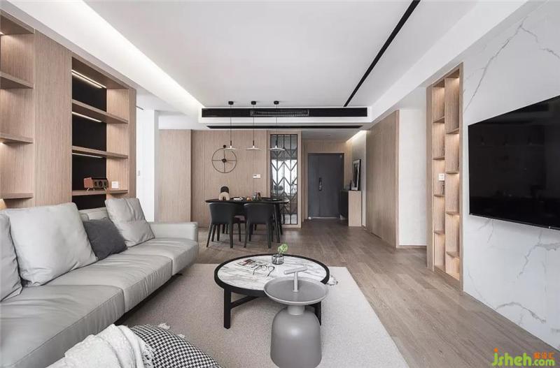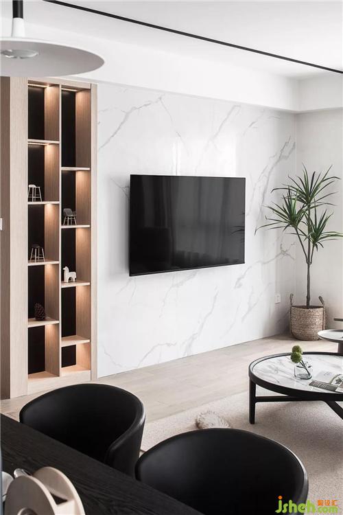 客廳吊頂無主燈。將需要照明的地方用黑色線條槽配以條形射燈,小吊燈、射燈代替,局部分散照明可以讓空間更有層次感。整個(gè)墻面空間都是大面積留白,局部搭配木飾面配以黑色,既溫暖又年輕時(shí)尚。