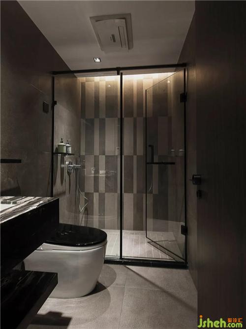 高貴典雅的墨綠色墻面和頂棚穿插著混搭淺灰色巧克力瓷磚,讓色彩自在游弋,煥然新生。