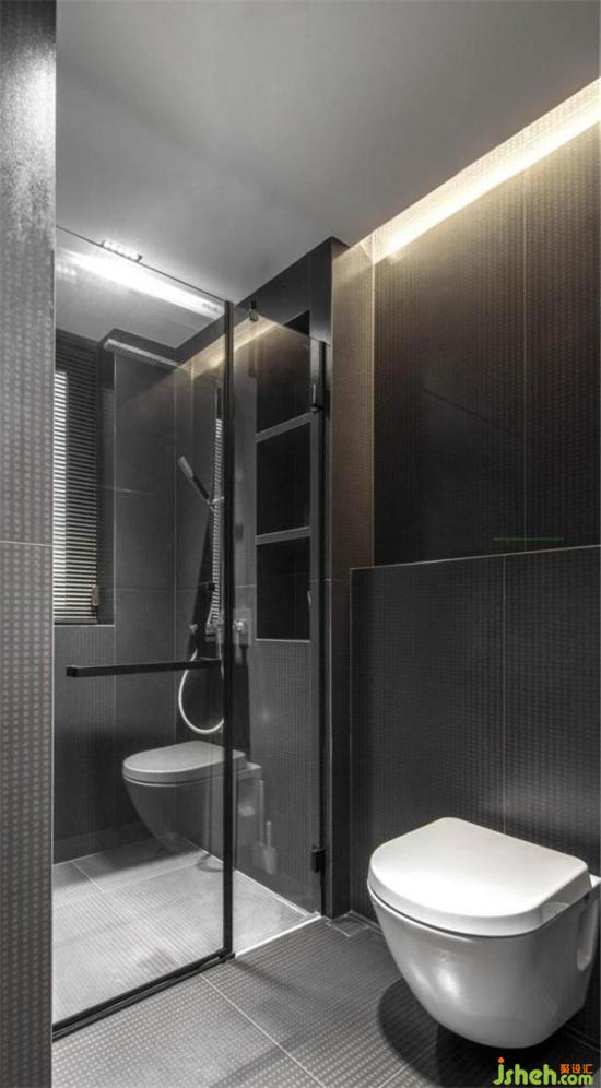 主衛(wèi)使用黑色與白色作為空間的主色調(diào),營造干凈純粹的視覺上躍豪宅設(shè)計(jì)感受。衛(wèi)浴間通過干濕分離的設(shè)計(jì)美觀又實(shí)用,大面積的黑色,顯得沉穩(wěn)而高級(jí)。
