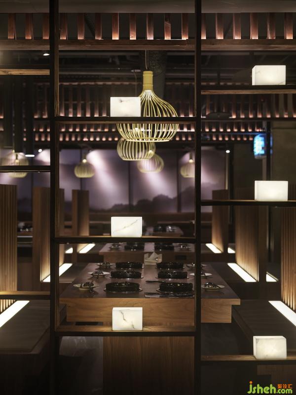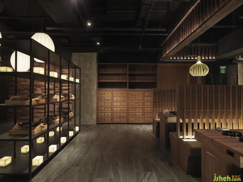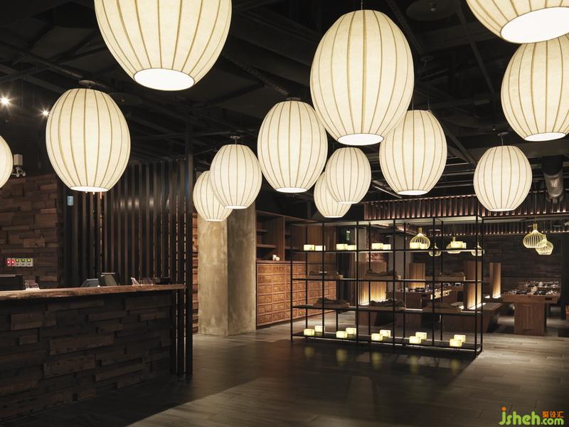 七百余多座位,處處擁端景。多向動線多處節(jié)點中,以大小端景延續(xù)焦點,使空間區(qū)塊豐富更俱可看。視覺原素延續(xù)品牌調(diào)性統(tǒng)一,有木作裝飾錯落、垂直性格柵、東方元素藥柜、藥盒、栓馬柱、燈籠等,取材皆用心尋覓于兩岸多處。中有一處對花大理石,以枯木山水黑白階為其紋理韻致相俱自由奔放。位席間以立面呈紋理玻璃崁黑鐵件錯落穿插于席間的通透隔屏,為大空間中的座位領(lǐng)域形式作出區(qū)隔劃分。室內(nèi)設(shè)計師