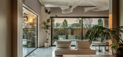 別墅裝修設(shè)計(jì)連客廳的角落、電梯出口處也留下一扇玻璃窗,