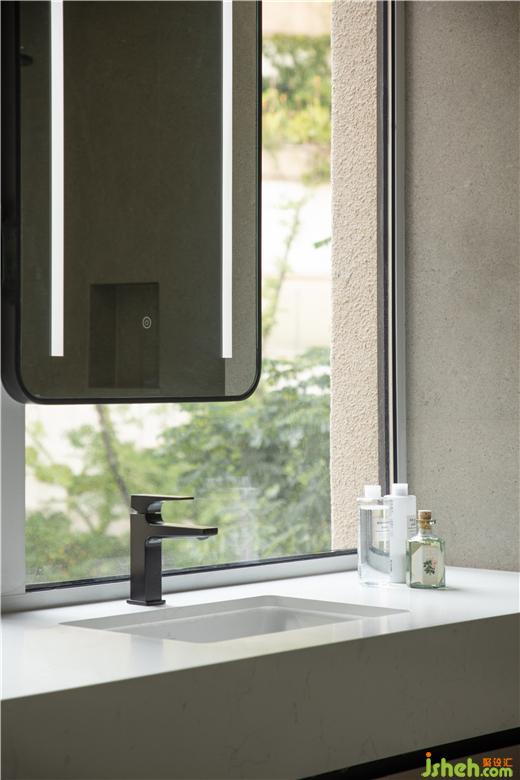 衛(wèi)生間冷灰瓷磚、大理石臺盆、柔軟地毯,