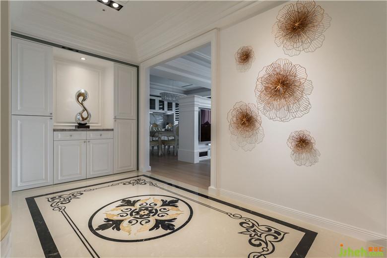 此案裝修公司將新科技智能家電融入新古典的空間,明亮純凈的玄關空間,運用優(yōu)雅花瓣紋路大理石、菱格灰鏡、歐式門片及牡丹墻飾,創(chuàng)造出以花開富貴為主題之典雅迎賓的場域氛圍,整體空間以訂制歐式家具為主角,進而以新古典歐式純白風格來襯托