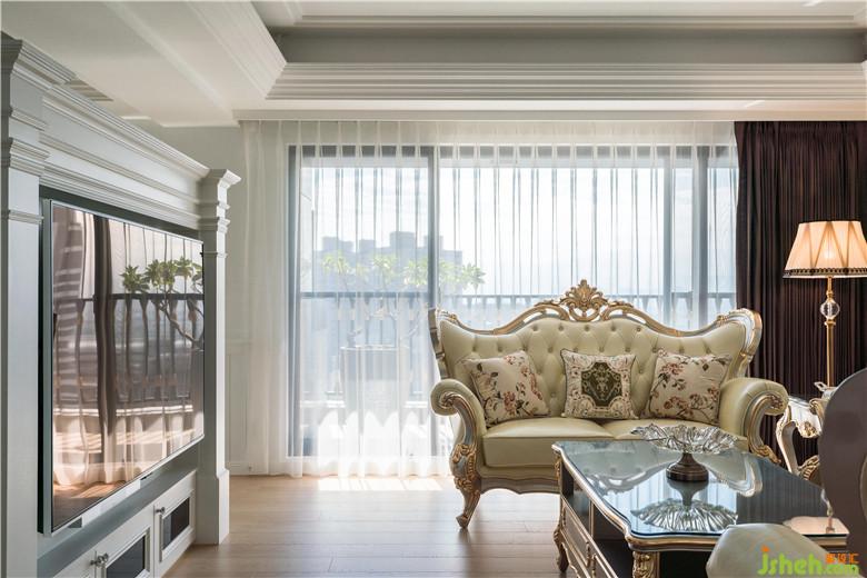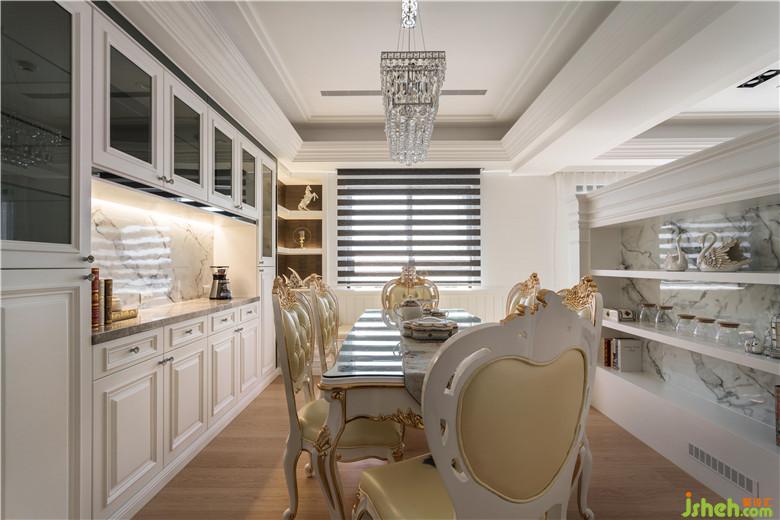 客廳電視墻以潔白優(yōu)雅的壁爐呈現(xiàn),與純白層次的線條天花及歐式沙發(fā)背墻相呼應,裝修公司以壁爐作為客廳和餐桌之區(qū)隔,歐式壁爐由設計師依線條比例繪圖設計,呈現(xiàn)完美線條襯托屋主氣質