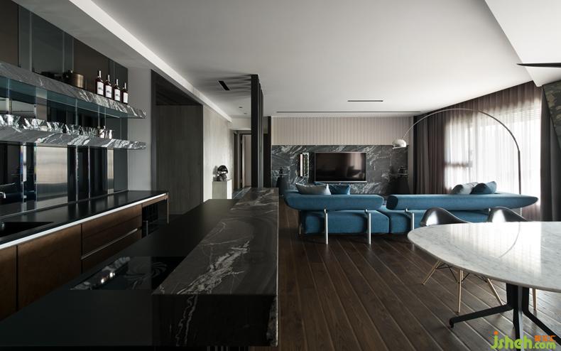 本案即運用了多采多姿的燈光演繹技巧,像是客廳電視牆上方的白色格柵層,就因為洗牆燈光的烘托,幻化迷人的明暗層次,而吧檯區(qū)背景的間接光,以及餐桌上方形似飛行器的設(shè)計款燈飾,也都恰如其分地發(fā)揮或聚焦、或為情境加分的效果。