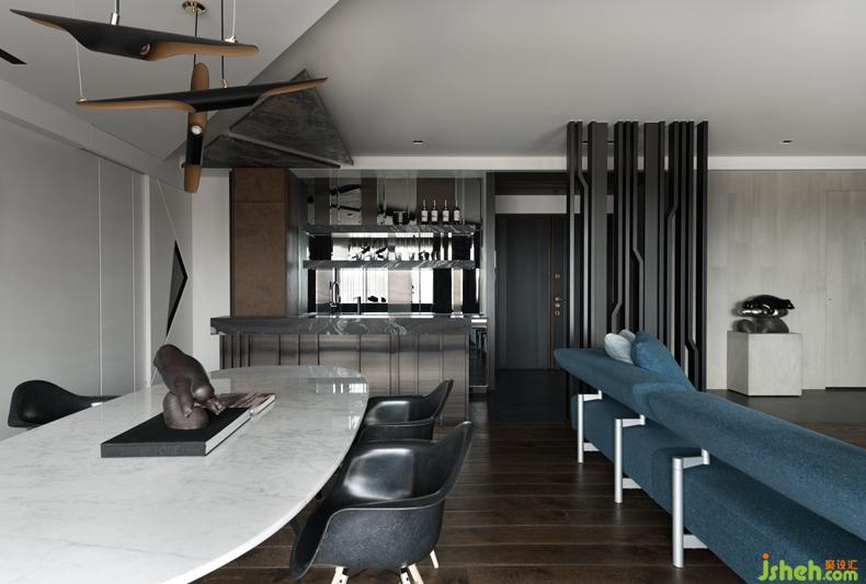隨著腳步進入公領(lǐng)域,開放規(guī)劃的客廳、餐廳、輕食吧檯區(qū)三者,形成一處景深共享、機能互補的生活聚落,而自吧檯區(qū)上方向著落地大窗方向,設(shè)計者以面積大小不一的三角板塊,打造自天花板向牆面轉(zhuǎn)折延伸,一氣呵成的翼狀造型,其間穿插著木作、薄石板、鐵件等材質(zhì)的階段變化,在背景光的襯托下,釋放宛如蓄勢起飛的能量,而共處開放領(lǐng)域的不同單元間,也能彼此交疊、延伸、再分界。