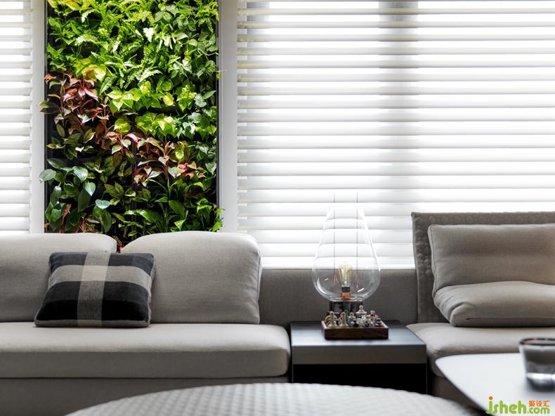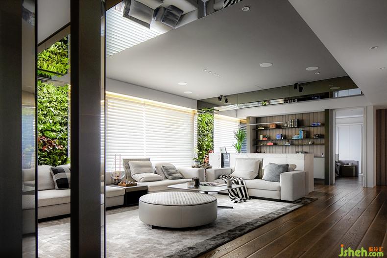 首先在客廳窗與窗間的結(jié)構(gòu)柱位置,大膽導入室內(nèi)植生墻設計,結(jié)合專利的滴灌系統(tǒng)與照明,帶動居宅內(nèi)全時段進行的活氧光合作用,而在兩列縱向的植生墻上方天頂,依等寬設置兩座為橫樑的水平向鏡盒,借鏡面倒影創(chuàng)造全視角的室內(nèi)花園意象,目光所至,一天的疲勞跟著煙消云散。