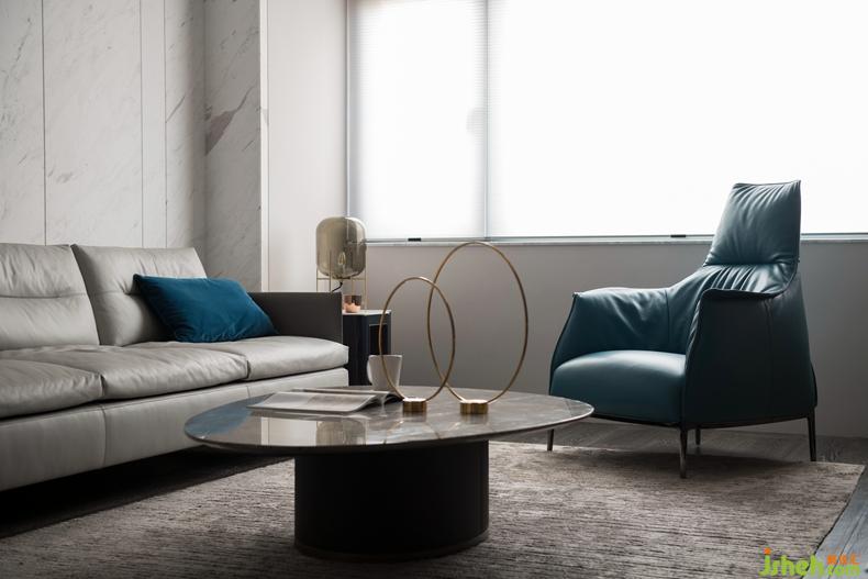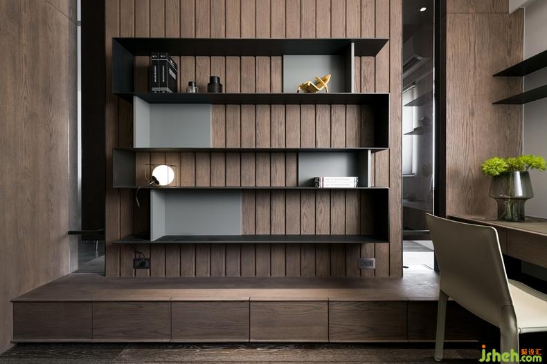 公領(lǐng)域天花板的平整、干凈,有效拉升仰角視野,客廳電視墻與沙發(fā)背墻的線性解構(gòu)則各有表述,首先大量鋼刷木料施作的電視墻,同時也是客廳、書房的共用介質(zhì),正立面導入X型立體剖面設(shè)計,抽象筆觸創(chuàng)造背光陰影下不同角度里的驚喜,兩側(cè)各懸掛一座鑲嵌薄巖板的鐵件框飾,不只為電視墻構(gòu)圖增加層次,更是隔間前移概念的創(chuàng)意演出,而透過鐵件框下的灰玻還能看見墻后書房區(qū)若隱若現(xiàn)的景致。選用啞光大理石直列分切、轉(zhuǎn)折、錯拼而成的沙發(fā)背墻,隨興織就的天然紋理,遠比刻意對花來得迷人,而在背光掩映與刻意不貼到頂?shù)氖址ㄏ?,一派動人的純凈與輕盈自然涌現(xiàn),左側(cè)另嵌入一座電壁爐,賦予空間恰到好處的個性與溫度。