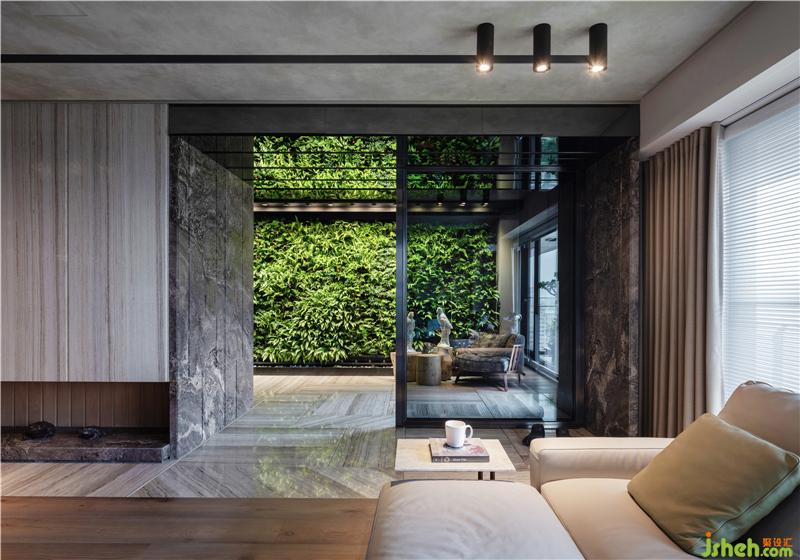 全宅雖擁有三面采光的大戶優(yōu)勢,但進(jìn)門玄關(guān)處卻明顯偏暗,因此我們打造一整面植生墻,營造一回家便如同走入一座森林、大反差的情境驚艷引人入勝,實(shí)作上并搭配灰鏡天花板,加上色溫接近天然光的照明計(jì)畫,一舉突破暗區(qū)限制,成功借凸顯大面植生墻的蓬勃綠意,熱情迎賓也醞釀場域包容力,地坪則選用質(zhì)樸木紋石,精工裁成不同大小、紋理行交丁錯(cuò)拼,于極度和諧舒服的暖調(diào)中,釋放宛如置身大自然的療愈氛圍。裝修公司