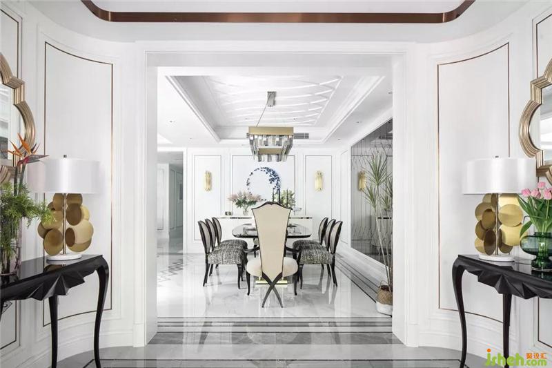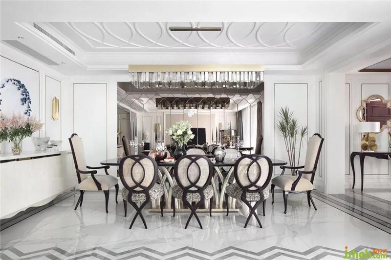 開敞明亮的餐廳以餐桌椅纖細(xì)優(yōu)雅的線條,中和了空間的莊重感,使之不過(guò)于沉滯,多了幾絲溫軟清逸的氣息。天花板的魚形紋與餐椅相呼應(yīng),婉曲相疊間,與地上的水波紋交織在一起,靈動(dòng)多姿。