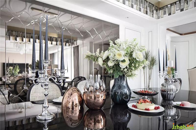 西廚烘焙區(qū)功能多樣,區(qū)別于傳統(tǒng)的島臺(tái),既可用來(lái)準(zhǔn)備各類烘焙美食,又可用來(lái)享受早餐。閃亮奪目的餐具質(zhì)感十足,在餐桌上的倒影不經(jīng)意間流溢出藝術(shù)之美。