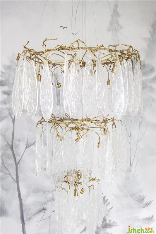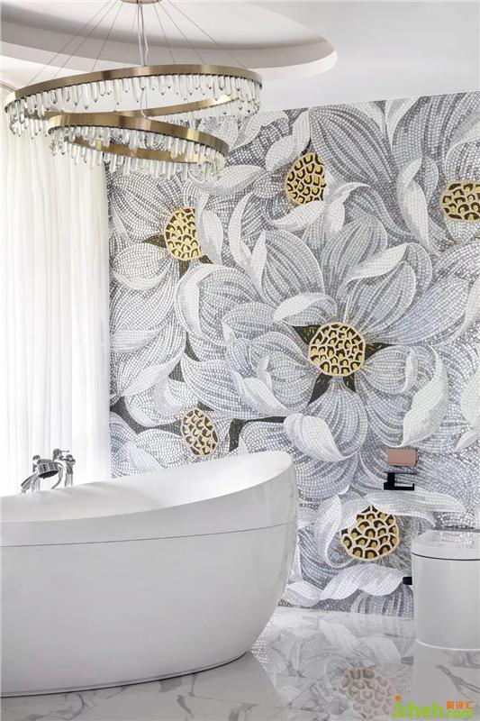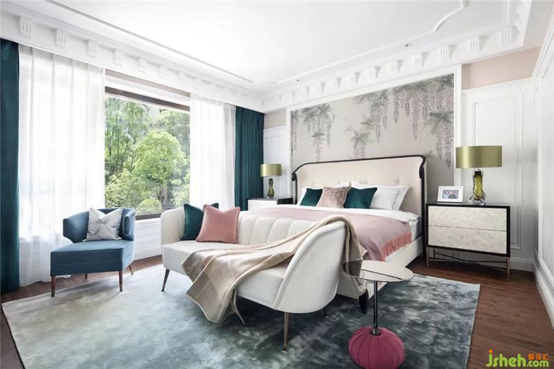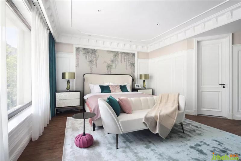 主臥,色彩浪漫恬淡,清新可人,營造出寧謐自然的氛圍,溫柔熨帖,又慵懶隨性,墻面上垂瀉下來的紫藤蘿瀑布,像一個浪漫甜蜜的紫色夢境。