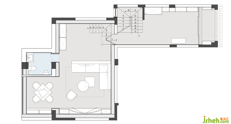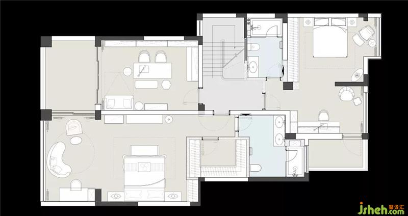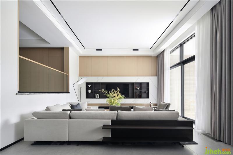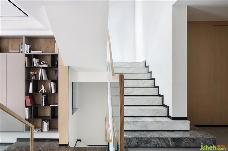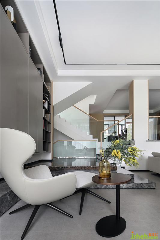 為了兼顧負(fù)一樓下沉空間的高度,我們在一樓休閑廳的書柜處做了整體抬高的平臺,使之與負(fù)一樓的樓梯間一起,形成更為錯落有致的空間層次感。