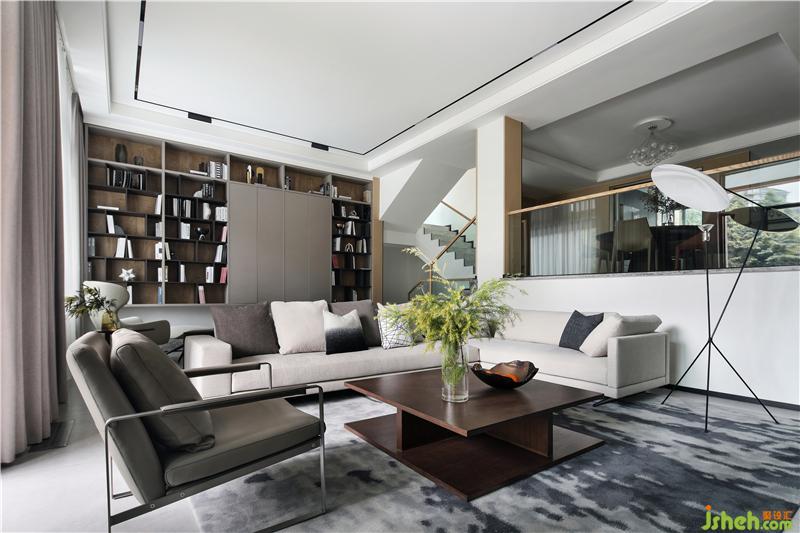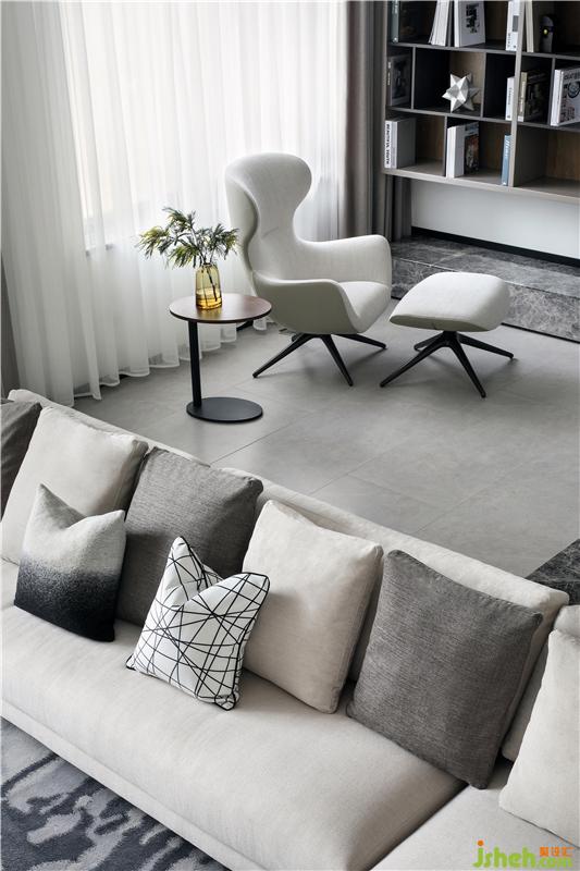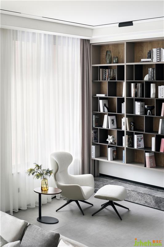 休閑廳為客廳的補(bǔ)充空間,位于樓梯平臺(tái)旁,沉穩(wěn)質(zhì)感的書(shū)柜鋪滿整面墻,如源頭活水般浸潤(rùn)著整個(gè)空間,正是“書(shū)卷多情似故人,晨昏憂樂(lè)每相親”。