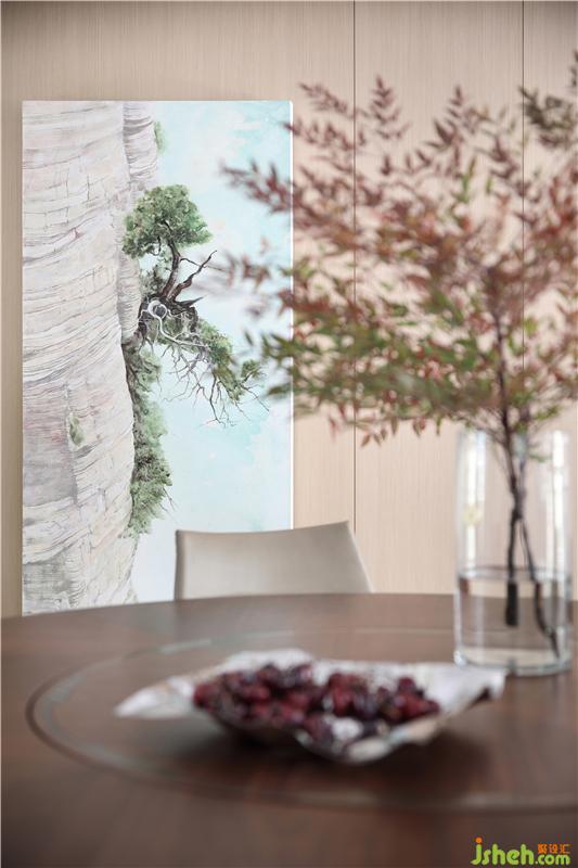 原木材質(zhì)的家具,油畫(huà)中遒勁的峭壁蒼松,餐桌上的疏影橫斜的瓶盞,自然質(zhì)樸,在濃淡相宜的雅致中,愈增清新與活力。