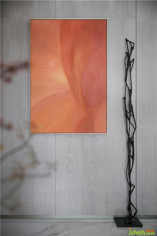 門廳處的橙色版畫以熱烈的姿態(tài)迎接著來訪者,它是整個(gè)空間中色彩的燃點(diǎn)。用自己耀眼的明麗中和著灰調(diào)的沉滯,宛若尼采筆下的“酒神狂歡”。