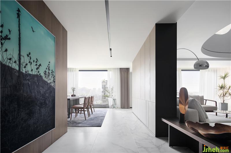 縱深通透的客廳并非乏味得一覽無余,而是在“似斷非斷”、“似隔非隔”的張力下獨(dú)具魅力。穿過客廳可以直接望到茶書房,空間的立體層次,讓人在其中行走的動(dòng)線更加自由而靈活。