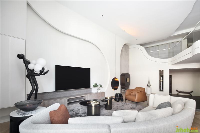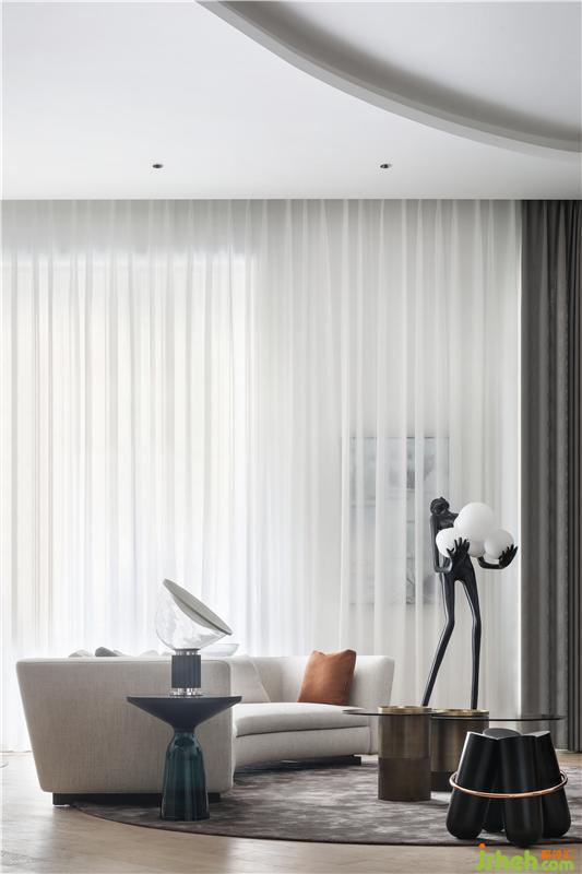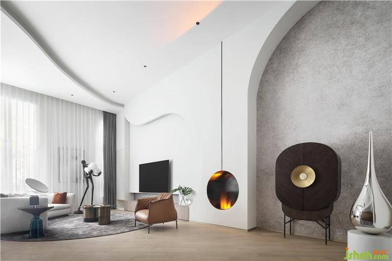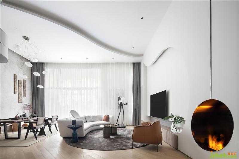 空間將曲線的幾種幾何類型表達(dá)得淋漓盡致,并將“曲”的精神氣質(zhì)貫穿始終,將圓弧線的飽滿與穩(wěn)定,橢圓線的擠壓與拉伸,拋物線的對稱與方向,雙曲線的平衡與流暢,自由曲線的隨意與自然,巧妙交織在一起,形成了相對的規(guī)則性、秩序性和穩(wěn)定性,就像重慶火鍋對各類食材的接受包容以及將其融于老油鍋底所產(chǎn)生的醇香和諧。 吊頂、壁爐、沙發(fā)、電視墻中的圓弧線設(shè)計(jì),從形態(tài)上表現(xiàn)飽滿、穩(wěn)定的視覺效果??臻g以不同體量、相互交錯的平面圓弧為結(jié)構(gòu),實(shí)現(xiàn)了不同功能區(qū)域的劃分。走廊無規(guī)律的自由曲線形態(tài),充滿了飄動感與動人的詩意。各類曲線形態(tài)錯落串聯(lián),營造出優(yōu)雅、浪漫、溫婉的空間氛圍。