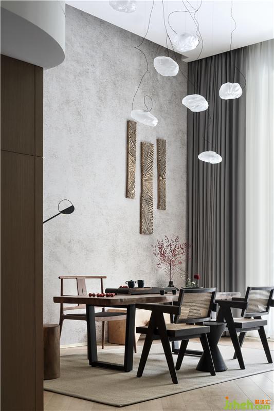 空間中“曲”的主題在茶室中得到了延續(xù),恣肆的曲線垂下輕盈無瑕的白色花朵燈。挑高的墻壁塊面,在視覺上將整個空間做了向上的拉伸,使整個空間富于開闊之感。內(nèi)斂克制的灰色墻紙,生發(fā)出生機(jī)勃勃的叢竹、禽鳥,頗具自然小品的清新意趣。