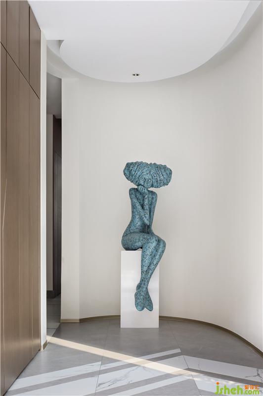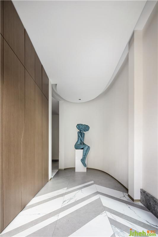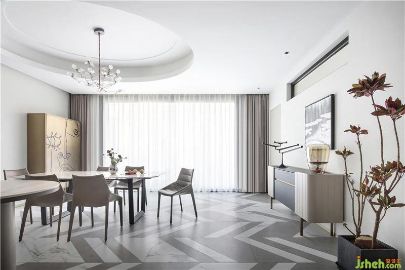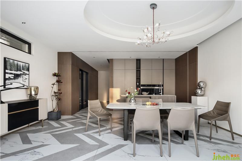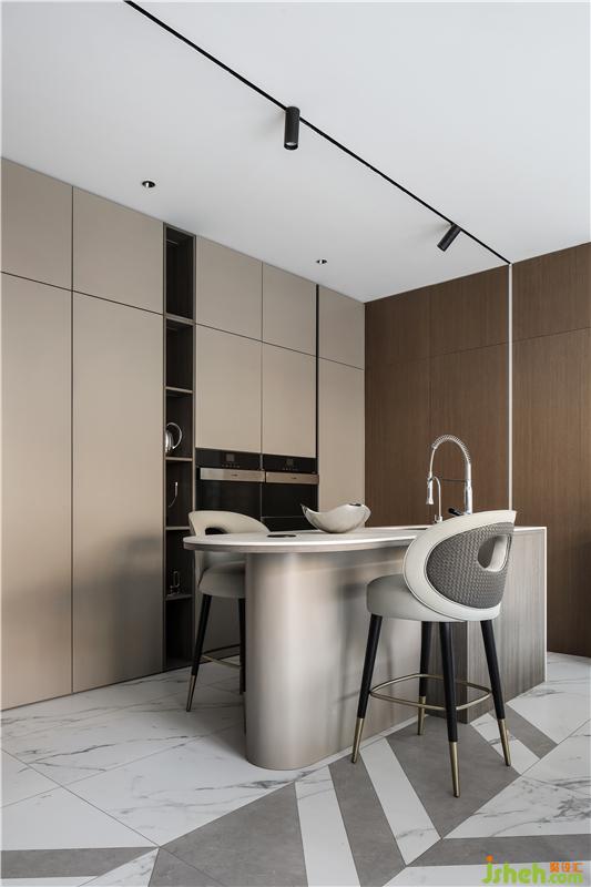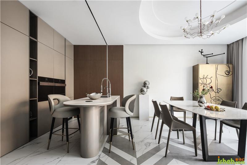 菱形地拼向內(nèi)延伸至餐廚空間,富于幾何造型的多變。相對(duì)規(guī)則、接近正圓的橢圓形的吊頂,與空間中的“方”元素,形成剛?cè)嵯酀?jì)的穩(wěn)定感與力度感,同時(shí)漫向四周的擴(kuò)張感,減弱了平面橫線造成的壓抑。讓空間更加收放自如。 收納有序、干凈利落的餐廚空間,將開放的西廚空間與封閉的中廚空間巧妙結(jié)合,兼顧西廚空間的日常社交與中廚空間的油煙隔離。西廚與餐廳之間是完全開敞的,島臺(tái)不僅可以洗菜備餐,更可以作為吧臺(tái)和臨時(shí)餐桌使用,它成為廚房的過(guò)度邊界,也是將廚房與生活相連的紐帶,可以隨時(shí)暢享休閑愜意的咖啡時(shí)光,還可以坐在這里與準(zhǔn)備美食的家人親密交流和互動(dòng)。