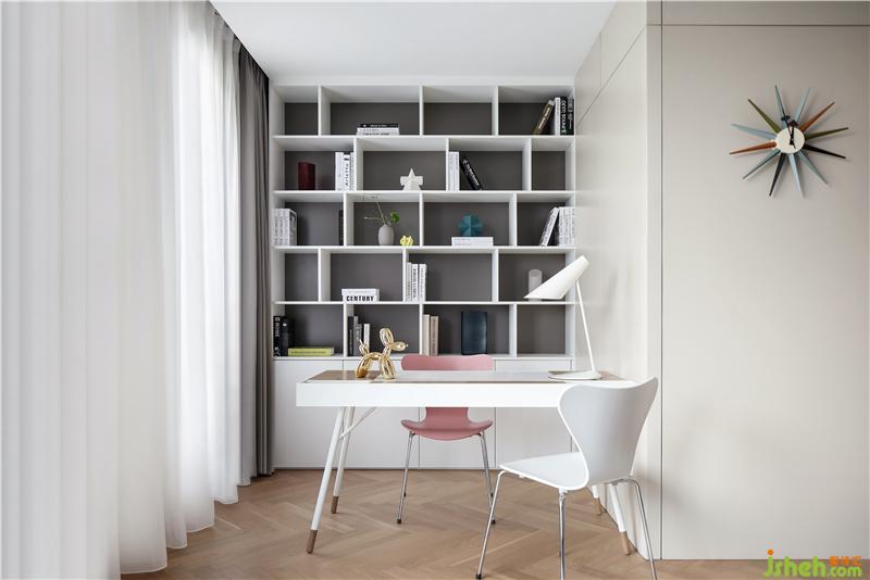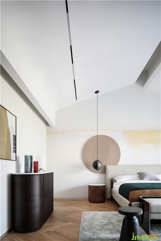 設(shè)計師將三樓逼仄不合理的原始平面加以改造與優(yōu)化,打造了全新的主臥套間,并對每一間房屋的面積進行了恰當(dāng)?shù)姆峙?,得到了更為合理的休憩之所?nbsp;吊頂一改常規(guī)的刻板定式,將矩形屋頂切割,做出下垂打開的弧度,高低錯落之間顯示出一種舒緩的節(jié)奏,向下的弧線構(gòu)成的形態(tài)帶給人一種接納與包容感,同時形成一種空間的趣味性,亦彰顯出居住者特立獨行的個性氣質(zhì)。