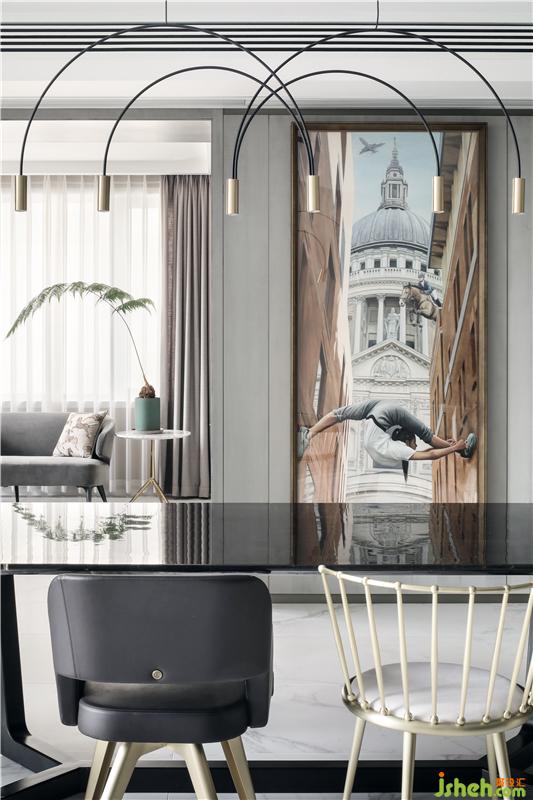 開(kāi)放式茶室,與客廳連通,選用質(zhì)感十足的黑金作為主色調(diào),營(yíng)造一方愜意的品茗修心之地。王念東的畫(huà)作《圣殿前的跨越》,在色系上與整個(gè)空間相呼應(yīng),畫(huà)面的動(dòng)感使空間的韻律別具一格。