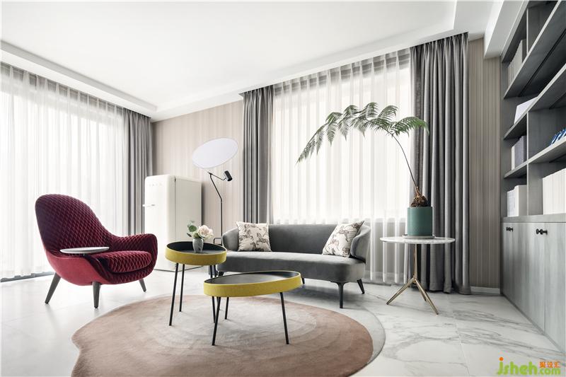 同樣位于一樓的家庭廳,在色塊的選用與比例上頗具匠心,紅色的單椅沙發(fā)顯得格外亮眼。金毛狗蕨盆栽氤氳著“山抹微云”的古典意境。