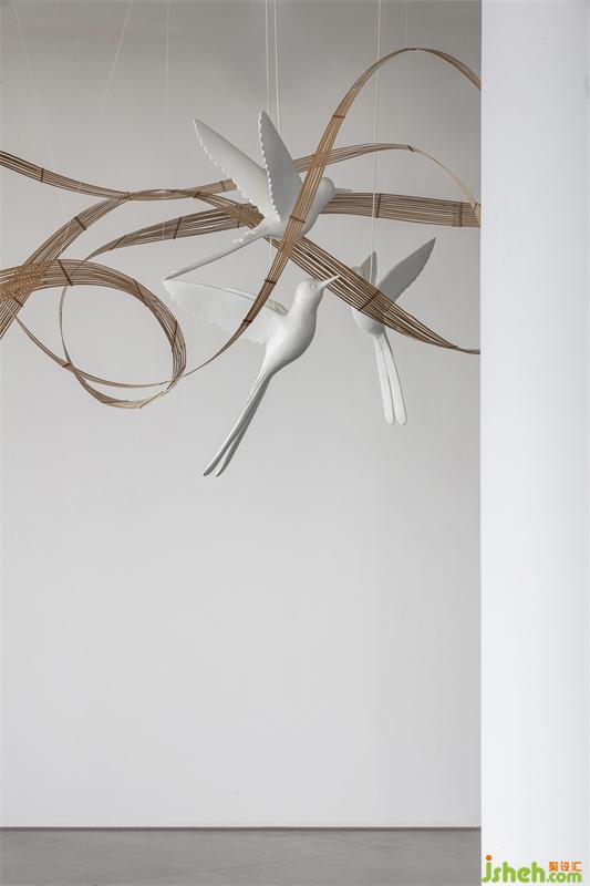 輕盈的竹編描繪出柔美的曲線,與輕快奮飛的飛鳥,在白色墻幕的原始肌理之下,空寂而純粹,不著一物,傍無所依,卻詩韻畢現(xiàn)。