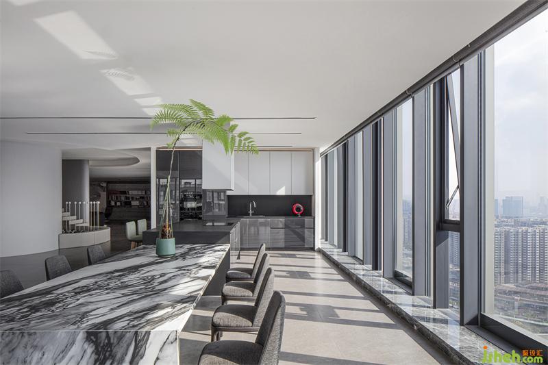 不同于傳統(tǒng)辦公空間將餐廚空間作為次要空間的一貫布局,新辦公區(qū)設(shè)計借吸納了西方餐廚空間的社交開放文化,餐廚空間同樣視野極佳,餐桌與島臺相連,長達(dá)7米,使得空間的縱深感進(jìn)一步延伸,顯得更為大氣朗闊,除了作為日常的項目方案溝通會議區(qū)外,這里還可作為休閑社交的沙龍分享區(qū)、私宴宴請區(qū)。