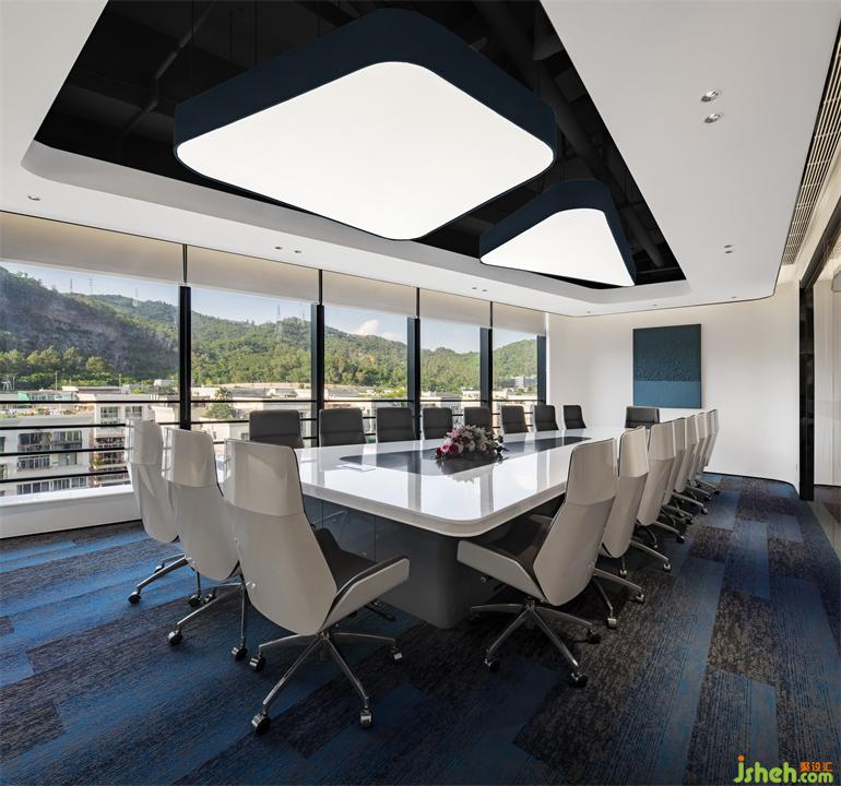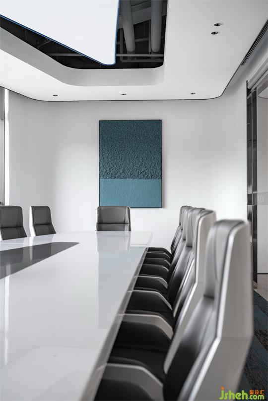 中型會議室利用了斜向空間的造型特點做梯形的天花做法。創(chuàng)造性的用兩組異形的發(fā)光燈片,巧妙布局、時尚酷炫。