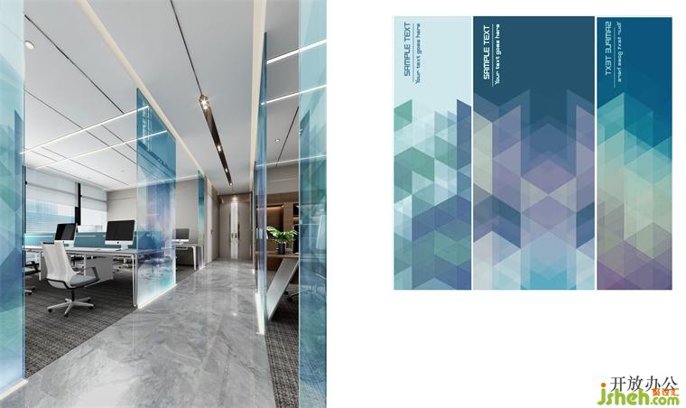 辦公區(qū)的走道兩側(cè)利用藝術(shù)的玻璃作為隔斷,空間層次分明,藝術(shù)圖案的冷色調(diào)點(diǎn)綴其中,形成中軸景觀。