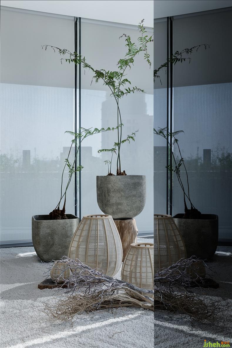 黑色巨石雕塑作為空間點綴,看似隨意放置,卻是恰到好處的美。屋外斑駁的樹影,庭院中的綠植、砂石,在半落的簾幕上映射出一幅縹緲的自然風光。