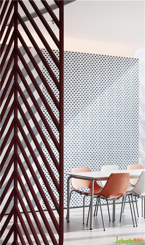 躍動的色彩搭配不同肌理的幾何圖案取代了中規(guī)中矩的灰白色系,大膽的對比挑逗人們的視覺神經(jīng),創(chuàng)造了明亮活潑、讓人眼前一亮的視覺焦點(diǎn),成功為空間減噪。 餐廳設(shè)計(jì)