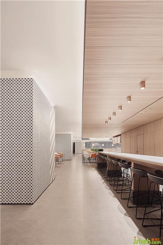 為了凸顯空間布局轉(zhuǎn)換,設(shè)計師采用大面積木飾面融入。自然的色調(diào)點綴出灰白對立的線條空間冷靜的溫度,在高冷基調(diào)中成為了融合而跳躍的存在。