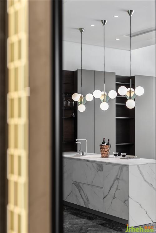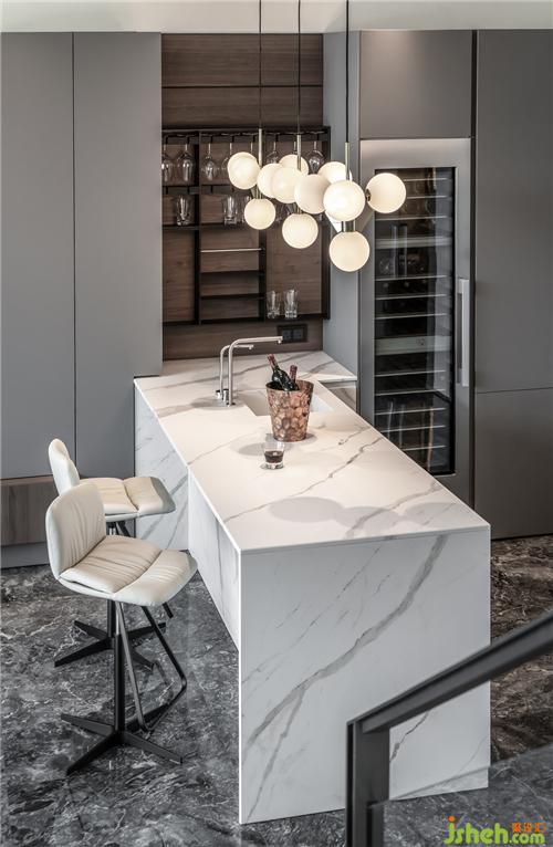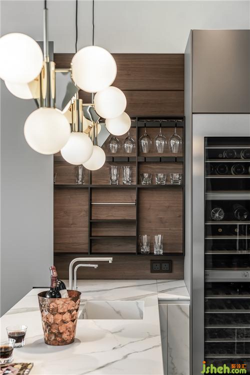 格調(diào)的考量不僅是表面所呈現(xiàn),更要關(guān)注生活化細(xì)節(jié)的處理。精心考量的紅酒架與折線臺(tái)面呈現(xiàn)一種貼心的比例契合,墻面嵌入式櫥柜有大量收納空間儲(chǔ)存廚具。