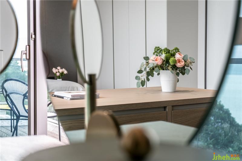 梳妝臺(tái)則選擇了Mashion Dada品牌,水曲柳和拉絲不銹鋼材質(zhì)相結(jié)合,清新柔和的綠色盡情展現(xiàn)女性氣質(zhì),兩個(gè)并列而交錯(cuò)的抽屜堆疊,別出新意的幾何造型,可愛而優(yōu)雅香港別墅裝飾。