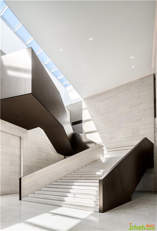 光影以極強(qiáng)的序列感,奏響起空間的前奏。自高處而下的光線使得墻面上的藝術(shù)品像漂浮于空中。自然光線透過(guò)天窗和結(jié)構(gòu)梁,空間中的墻和地板仿佛瞬間消融,為展示區(qū)留下了完美而純凈的背景。