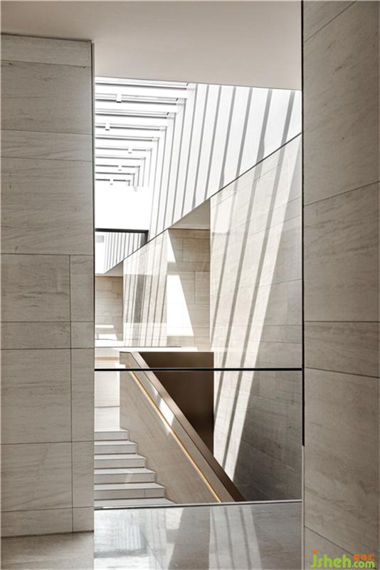 矩形立面素凈而典雅,每一塊石材有序地拼接,在同色調(diào)的單一材料的使用中創(chuàng)造出建筑的陰影和紋理。它不僅是一座建筑的立面,而是一個(gè)巨大的建筑雕塑。