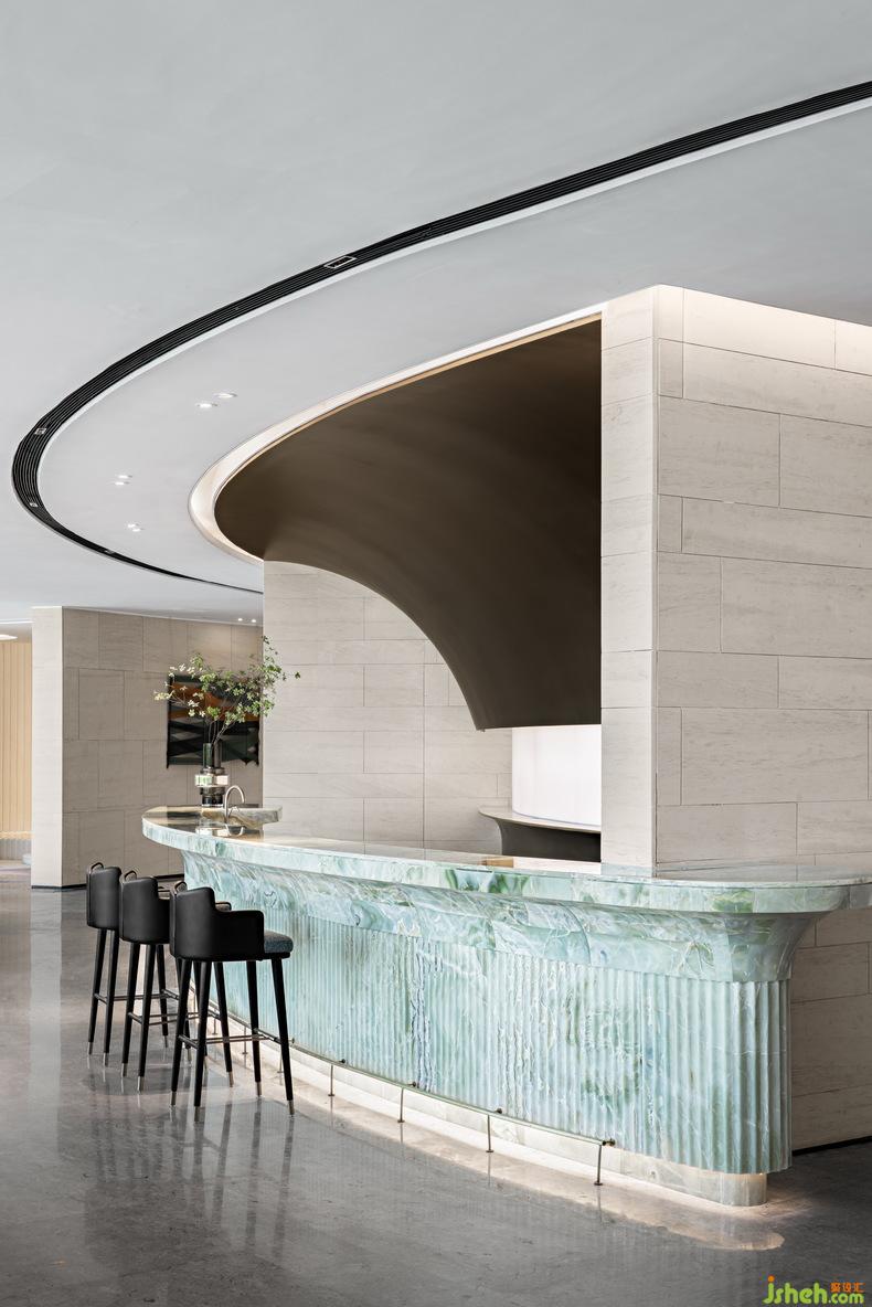 為了提升觀海的體驗,售樓處設(shè)計師在靠近連續(xù)落地窗的二層上空,開設(shè)了窄窄的條狀天窗。兩層通高的“花園式長廊”邀請自由的自然陽光,如鋼琴鍵般在冷暖相宜的理石墻面和地面上彈奏。室內(nèi)設(shè)計師帶有復(fù)古情調(diào)的海邊“空中清吧”詩意盎然,精致的金屬吧臺曲面背景與流線型前臺相呼應(yīng),也與華麗的奢侈品級青色玉石共同形成“享受時光流逝”的氛圍。