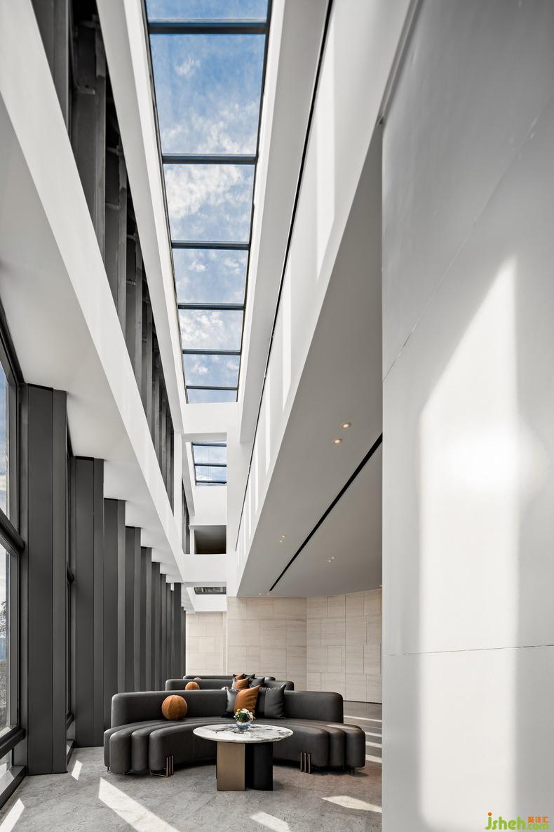 “島嶼客廳”的誕生也是如此:售樓處設(shè)計通過打通三層樓板和屋頂圓形天窗,超過14米高的核心空間——天光中庭應(yīng)運(yùn)而生。