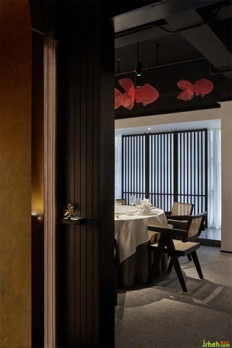 走廊處的構(gòu)思給空間定下了幽暗,舒適,餐廳設(shè)計親人的基調(diào)。
