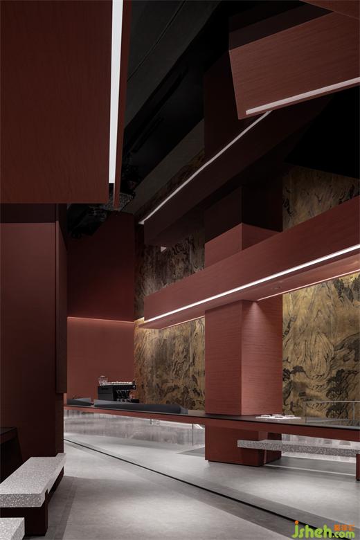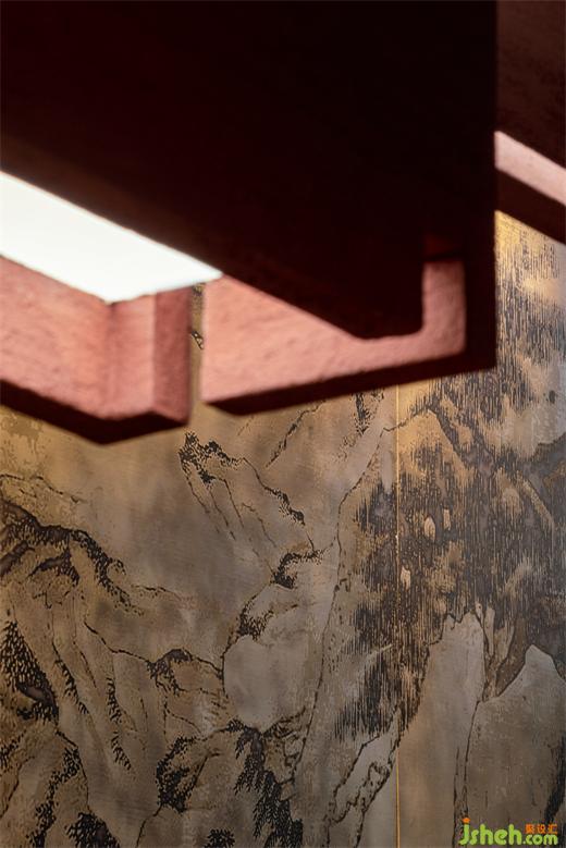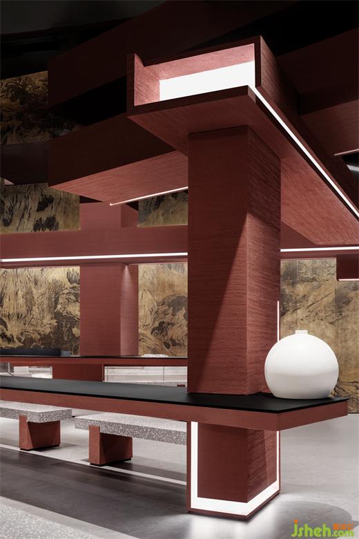 柱體粗糙的風化肌理外表下,包裹著代表未來與科技的光源內核,蘊含著古老與未來的巨大反差。