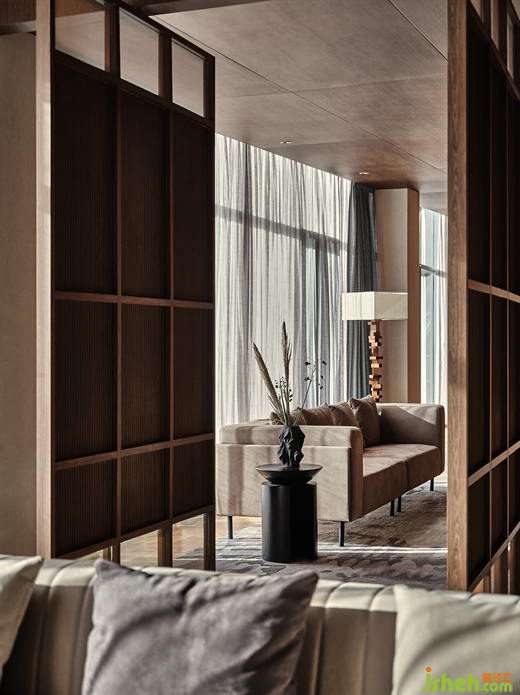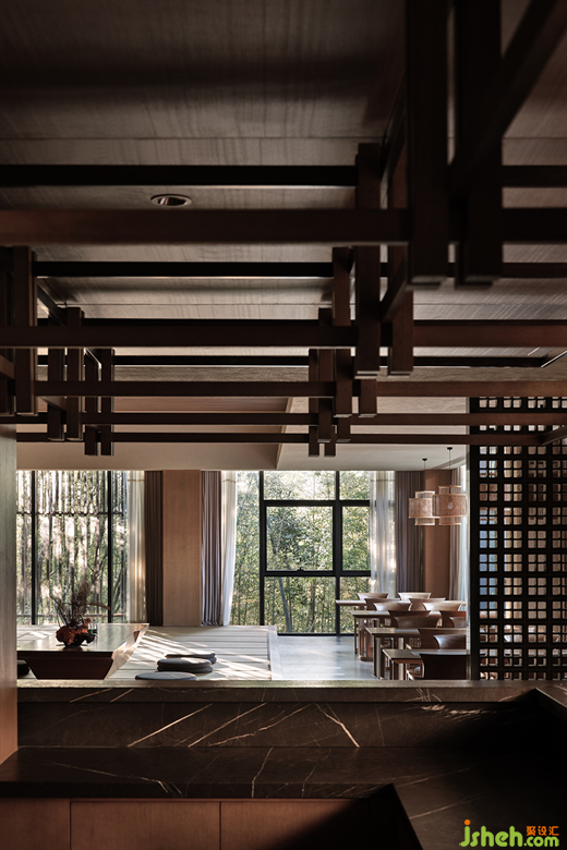 莊園酒店設(shè)計隨著日升月落,光明與陰翳的氛圍對比強烈,映在榻榻米上,襯托出安靜的禪境。這種“靜”,是與鳥啼、竹葉聲、腳步聲的細膩對照,讓人心曠神怡。