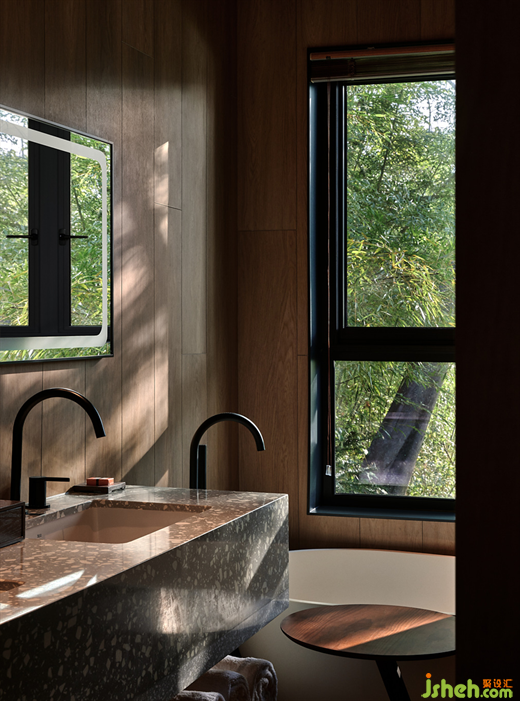 在莊園酒店設(shè)計師看來,建筑物與環(huán)境的和諧,從對在地性的思辨、挖掘與運用開始,這也是回歸自然的第一步。竹林雅居單臥院落以榻榻米的構(gòu)造,形成了日式風(fēng)格的旅居小屋,竹木貫穿于天地墻的造型中。一線天窗打開空間的自然視野,設(shè)計師在空間內(nèi)置入原木色的盒子體塊,再造層次感,與斑駁樹影相映成趣。