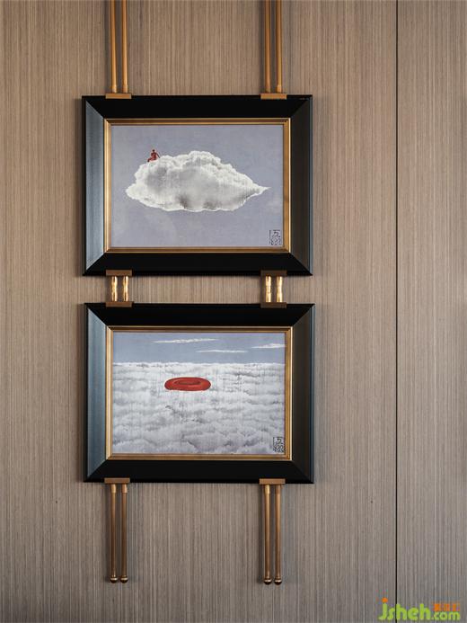 進(jìn)入玄關(guān),映入眼簾的一組藝術(shù)裝置,營(yíng)造了一種明月出天山,樣板房設(shè)計(jì)蒼茫云海間的詩(shī)意場(chǎng)景和儀式感。