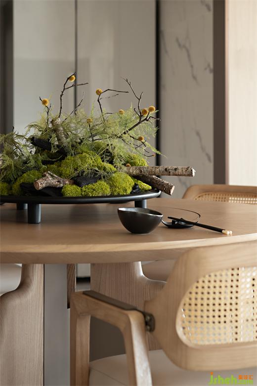 木質(zhì)色調(diào)顯得內(nèi)斂而富有質(zhì)感,把空間營(yíng)造出一種誘人的氛圍。天恒灣景復(fù)式海景庭院設(shè)計(jì)以枯木為底座的花藝,寓意著生命的循環(huán)往復(fù),從溫馨的原木到清新的綠枝,自然的溫潤(rùn)游走于空間。