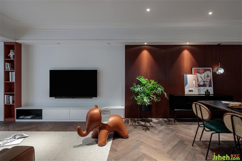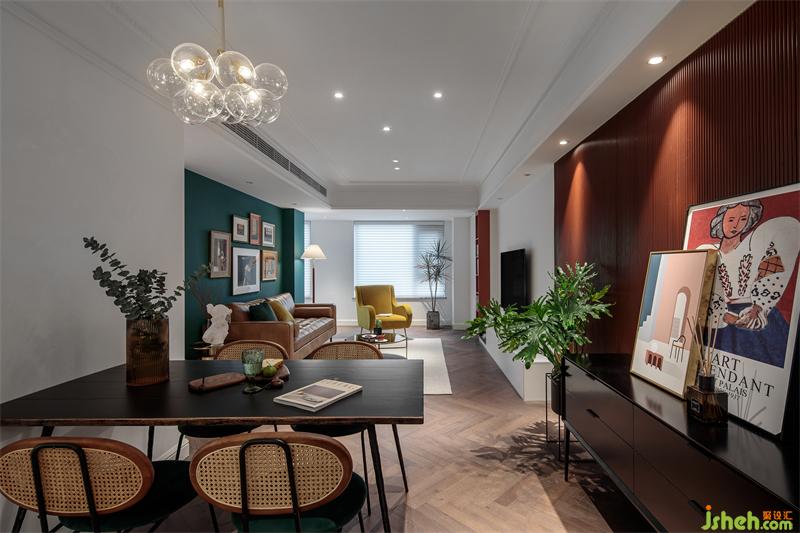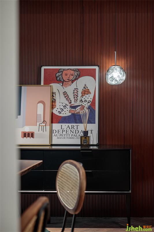 推門入眼,是耀眼的磚紅色,熱烈而朝氣蓬勃。墻面的紅色波浪板在能夠增加空間層次的同時(shí),也起到一定的過(guò)度作用,搭配墨綠色的竹編餐椅,在人字拼木地板的映襯下,復(fù)古而摩登。
