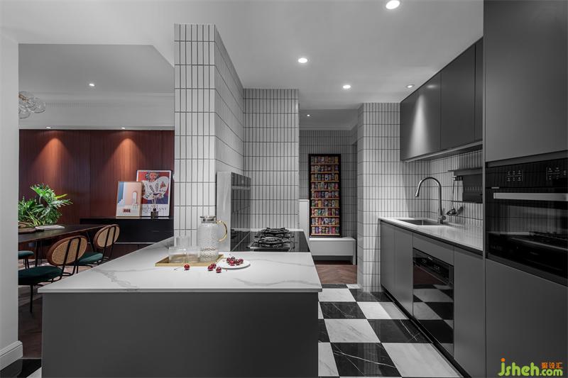 原廚房因?yàn)榭臻g獨(dú)立且形式單一,而導(dǎo)致空間具有局限性,設(shè)計師在考慮這些因素后決定打破常規(guī)。將廚房與生活陽臺之間墻面拆除,以極簡的玻璃隔斷一分為二,與餐廳形成一體設(shè)置成開放式廚房,最大程度的滿足廚房的功能需求,也離斷了原有的固定空間,讓整個空間變得自由寬闊,采光充足。黑白格子的瓷磚,增加空間的趣味性。