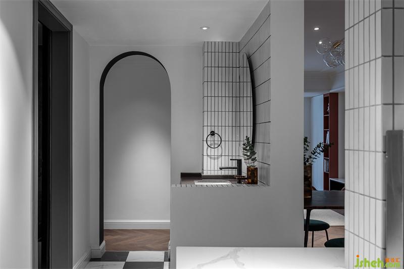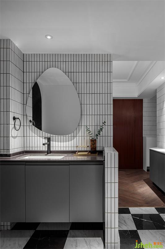 單從圖片上看,猶如迷宮一般,小小的空間每一處都是驚喜。在空間的規(guī)劃上犧牲了部分次臥空間,使公共區(qū)域的衛(wèi)生間能夠做到干濕分區(qū),提升使用率。水滴型的鏡子,搭配純白的馬賽克瓷磚,將空間點(diǎn)綴得更加有層次感。